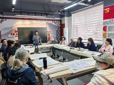 活动中,2024级音乐系步冰冰、王子墨、闫慧怡,绘画系乔文华,2025级设计系王煜霄、计宣宇、商镠、王金华、赵一诺,绘画系崔邺文等同学分工协作、各展所长。闫慧怡进行声乐表演,计宣宇讲解国画知识与水墨技法,阐释传统艺术文化内涵。社区居民亲手绘制了茶花、荷花等国画作品,感受中华优秀传统文化魅力。