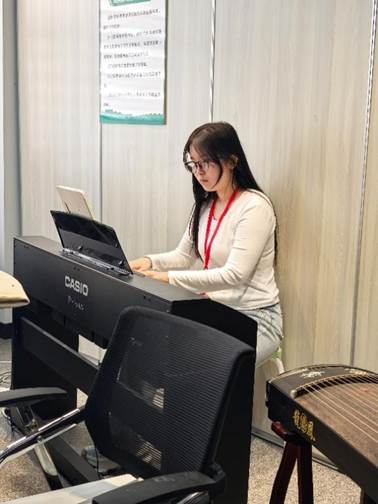 活动现场,音乐系步冰冰负责场地布置与活动统筹。美术系乔文华、杨锦添及设计系计宣宇开展花卉绘画公益教学,围绕构图、调色、笔触等内容示范教学,一对一指导居民创作。音乐系王澜锡、于佳鑫分别演奏民乐《夜深沉》、钢琴曲《月亮代表我的心》,悠扬乐曲营造雅致静谧的活动环境。