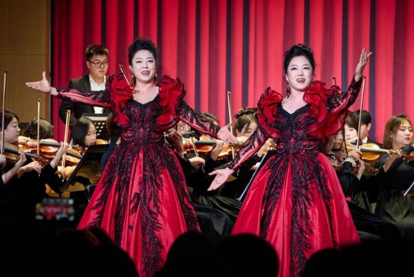 本场音乐会由吉林大学艺术学院师生共同完成,于洪晨担任交响乐团指挥。音乐会通过管弦乐、独唱、重唱、合唱等多种形式的经典作品为观众呈现了一场视听盛宴。拉赫玛尼诺夫的管弦乐《交响舞曲》为音乐会拉开帷幕,铿锵有力的旋律开场即瞬间点燃现场氛围,引领观众沉浸在浓厚的喜乐气氛中。张洪玉作曲的管弦乐《乡韵》传递出的乡音质朴悠扬,旋律饱含了对家乡的眷恋、对故土的深情。宁馨锐、宁馨磊的女声二重唱《帕米尔我的家乡多么美》融入塔吉克民族音乐元素,歌曲展现出帕米尔高原的壮美风光和军民共建边疆的动人图景。牛建博运用了单簧管的音域变化,通过丰富的音色层次将单簧管协奏曲《俄罗斯舞曲》的独特魅力展现得淋漓尽致。王端端带来的女声独唱《你们可知道什么是爱情》、惠铮(特邀)演唱的经典男声独唱歌曲《黎明》则以细腻的演唱技巧,将歌剧咏叹调与经典艺术歌曲的深层情感娓娓道来,动人心弦。